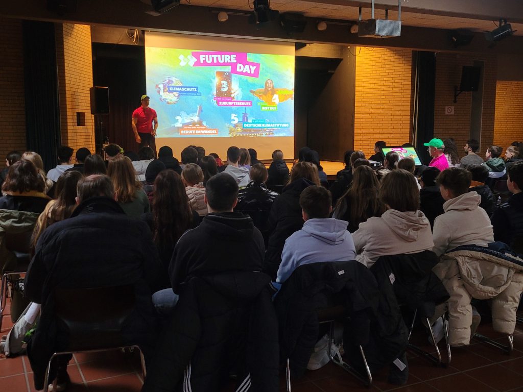 Am 20.3. fand an unserer Schule der von der Deutschen KlimaStiftung organisierte Future-Day statt. Der 8. Jahrgang wurde in einem spannenden Vortrag über nachhaltige Berufe informiert.